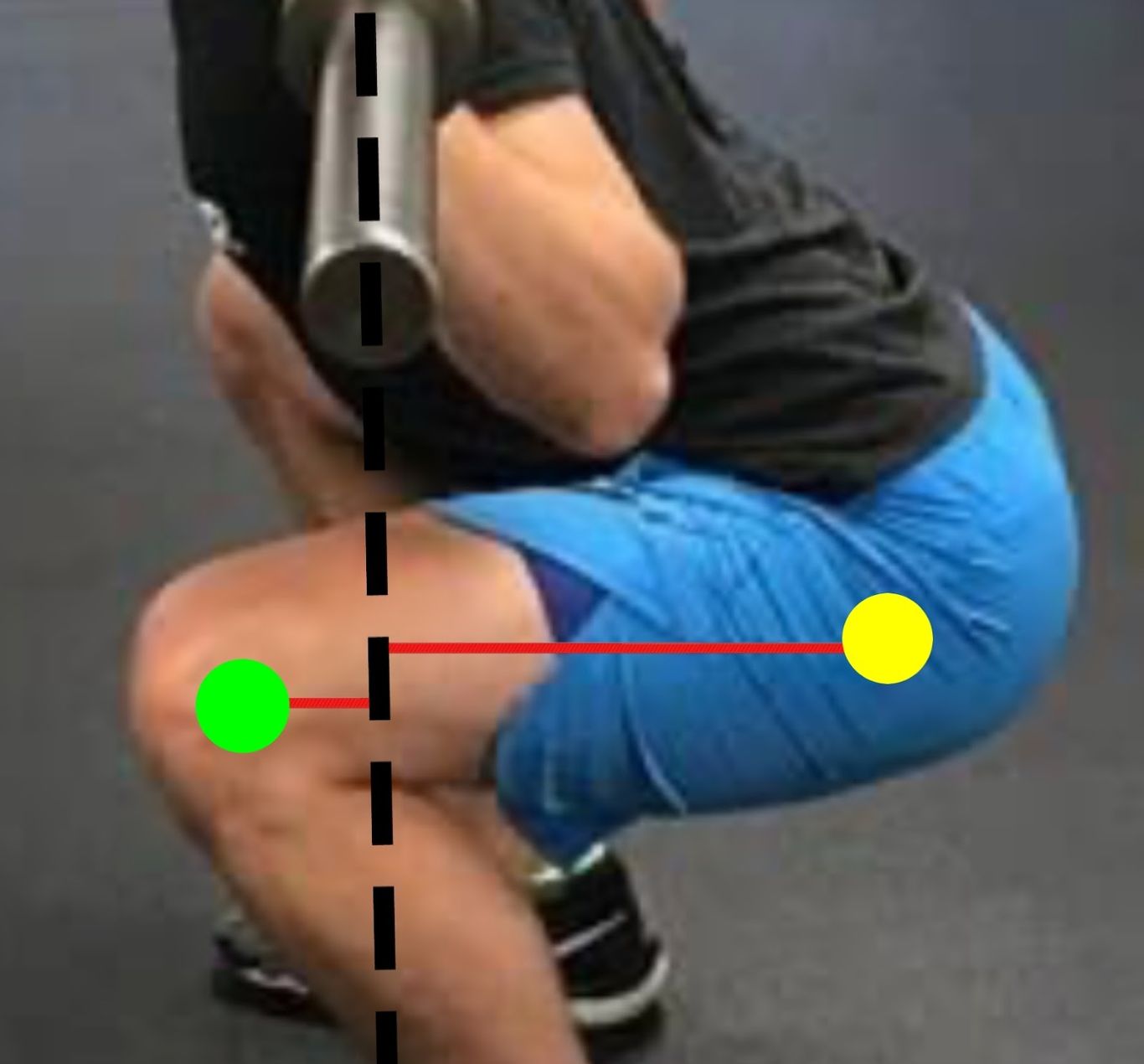 So we’ve established that we want both the load arm of the knee and hip to be as small as possible, but we can adjust our form to make either one of them proportionally longer or shorter. Ideally, we would have the load arm at the hip significantly longer than the load arm at the knee. This is because the musculature that is responsible for hip extension (the hamstrings and glutes) is significantly stronger than the quadriceps that perform knee extension. Therefore if we want to make it easier on any muscle during the squat we want it to be the quads.
